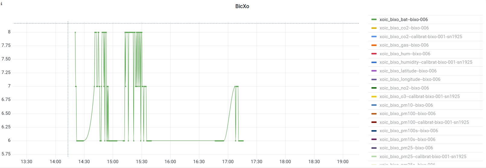 El dispositiu BiXo necessita carregar la bateria abans de funcionar. Aquesta càrrega es pot fer mitjançant una placa solar o a través del port USB amb un carregador convencional. Un cop la bateria té prou energia, el dispositiu s’intenta connectar automàticament a la xarxa LoRaWAN (TTN). Si aconsegueix cobertura, prepara els sensors i comença a enviar dades periòdicament mentre tingui bateria.